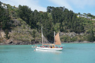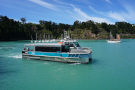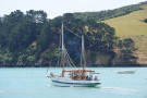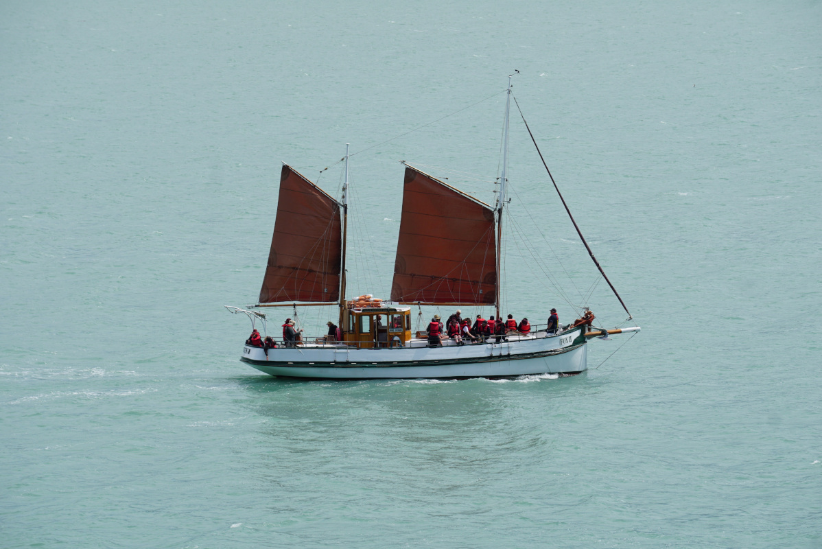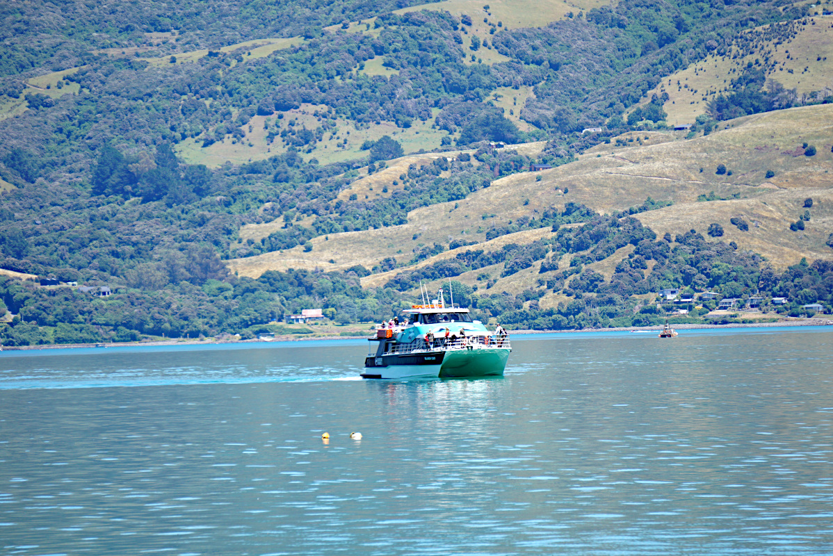 On a fine summer day the Black Cat returns to Akaroa from dolphin viewing cruise.