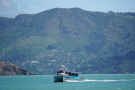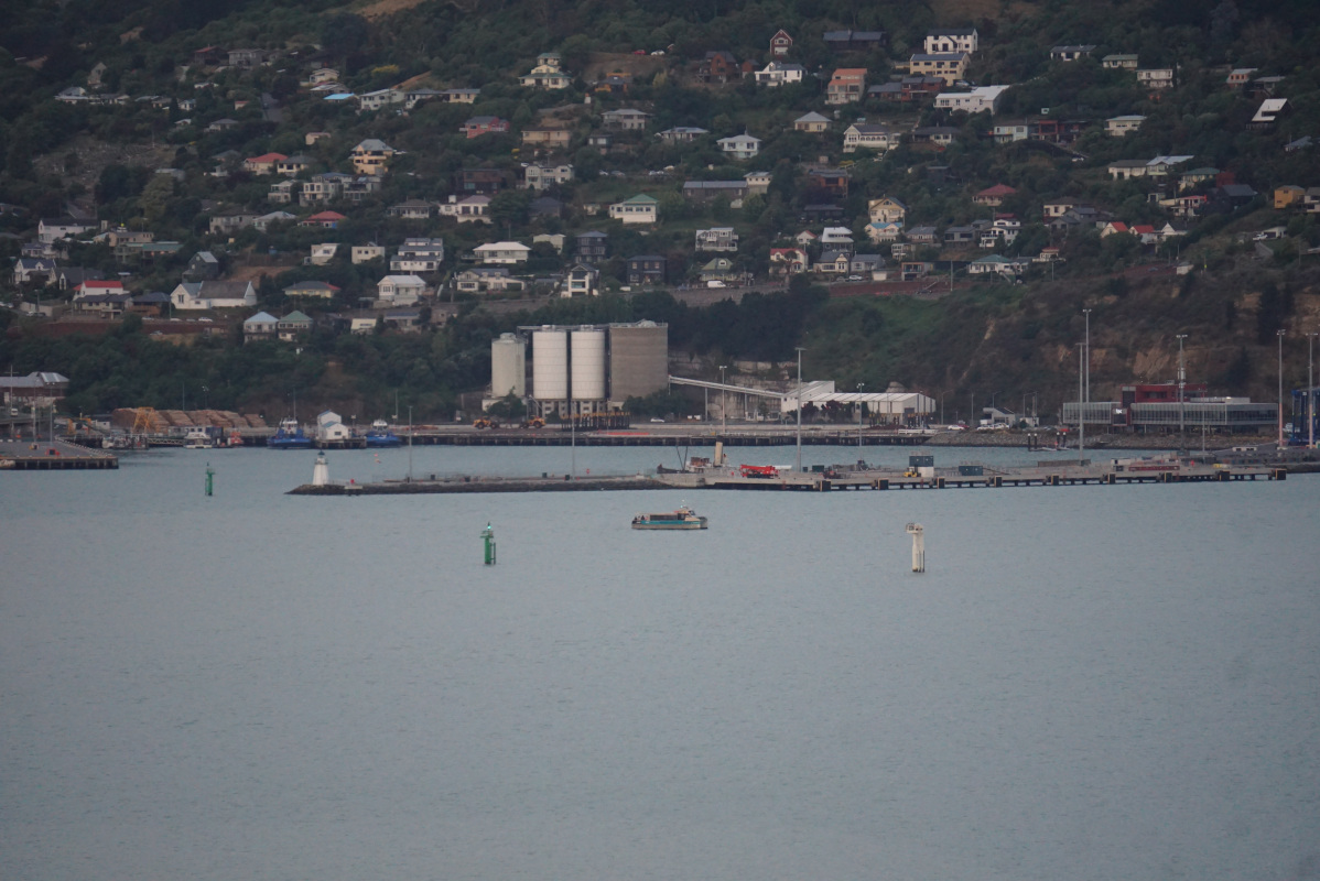 Here, it enters the inner harbour of Lyttelton while the ferry to Diamond Harbour leaves the port.