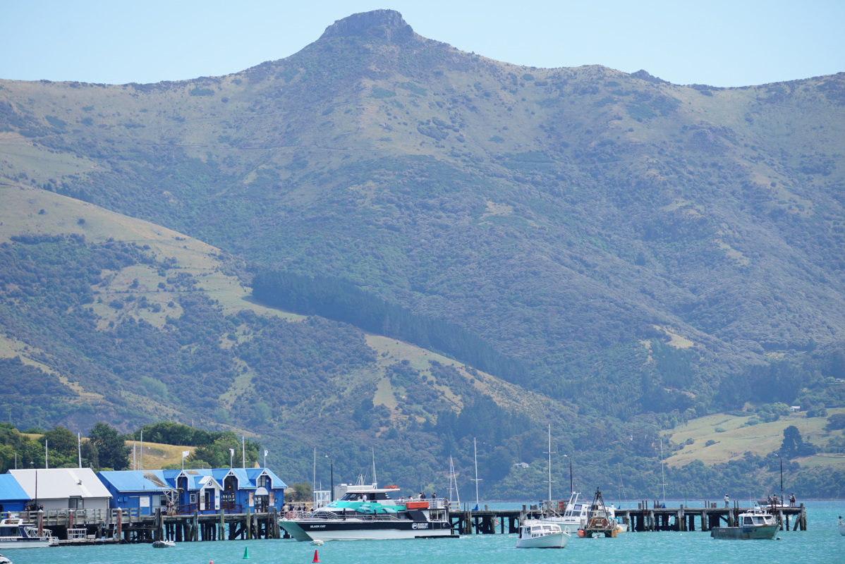 Akaroa Harbour is surrounded by hills up to 841 m above sea level.